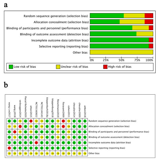 - Higgins, J.P.; Altman, D.G.; Gøtzsche, P.C.; Jüni, P.; Moher, D.; Oxman, A.D.; Savović, J.; Schulz, K.F.; Weeks, L.; Sterne, J.A.C.; et al. The Cochrane Collaboration’s tool for assessing risk of bias in randomised trials. BMJ 2011, 343, d5928. [Google Scholar] [CrossRef] [Green Version]