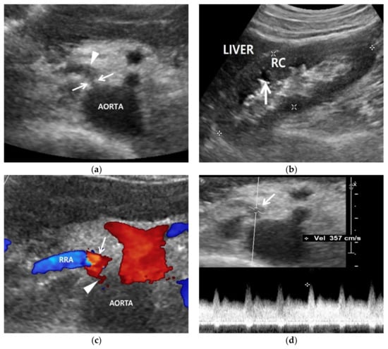 Gray-scale US is not well-known to be particularly useful in detecting RAS. Previously published studies did not clearly describe the imaging features of gray-scale US, but rather those of Doppler US. Renal artery occlusion was not directly assessed even in an animal study [45]. However, current gray-scale US has the potential to assess renal arteries directly because the ongoing development of US scanners is providing higher resolution imaging than before (Table 3). Transabdominal US can be used to evaluate proximal and middle segments of renal arteries. Transrenal US can be used to assess the distal segment of renal arteries in the flank. The location, number, and length can be shown depending on the patient’s obesity or bowel gas (Figure 2). Using a renal artery stent does not accurately detect RAS when it is invisible due to posterior sonic shadowing. Significant RAS is almost always accompanied by poststenotic dilatation [40]. High-speed and high-pressure blood flow, created by passing through the RAS, may contribute to expanding the lumen of the renal artery by means of repeatedly beating the endothelium. Calcified plaque, which is an atherosclerosis resulting from endothelial damage, is frequently encountered in RAS [46,47].