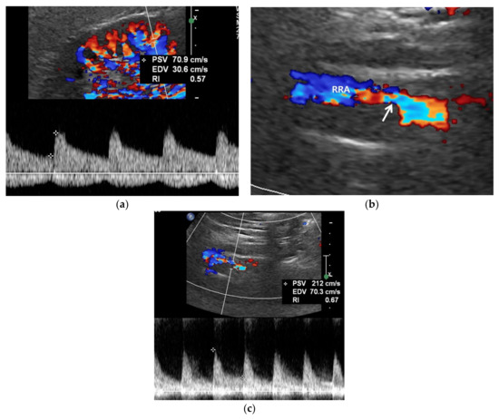 The frequency shift from the stenotic artery is not easy to detect with spectral Doppler US as it tends to be small (Figure 2 and Figure 3). There are some technical tips in assessing RAS: First, the critical angle between the renal artery flow and US from transducer should be observed when a good spectrum of arterial flow is not obtained. The optimal critical angle should be kept at 30–60° for detecting a good frequency shift [48]. Second, the sample volume size should be higher than that of the RAS to oversample frequency shifts. The renal artery spectrum can be identified by means of evaluating the flow direction and spectral pattern from among the various spectra given by arteries and veins. Third, the PSV of the renal artery should be measured in the poststenotic dilatation when a good spectrum cannot be obtained in the stenosis (Figure 2 and Figure 3). If the PSV is more than 180–200 cm/s, it will be higher in the stenotic artery. If RAS is severe, the frequency shifts are too weak to directly detect from the stenotic artery [23,49].