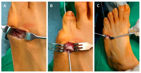 - Radl, R.; Leithner, A.; Koehler, W.; Scheipl, S.; Windhager, R. The modified distal horizontal metatarsal osteotomy for correction of bunionette deformity. Foot Ankle Int. 2005, 26, 454–457. [Google Scholar] [CrossRef]