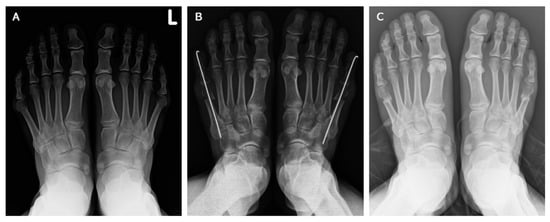 (A) Preoperative weightbearing anteroposterior radiographic image of both feet. (B) Anteroposterior radiographic image of both feet obtained immediately after the procedure. (C) Weightbearing anteroposterior radiographic image obtained 6 months after the procedure, showing bone union with good healing.