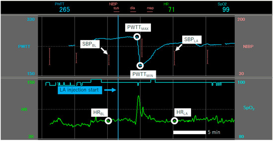 Baseline HR (HRBL) and baseline SBP (SBPBL) immediately before local anesthesia; heart rate after local anesthesia (HRLA); and systolic blood pressure (SBPLA) were also recorded at 5 min after local anesthesia. Value for ΔPWTT. Crest PWTT wave (PWTTMAX) value; trough PWTT wave (PWTTMIN) value. Unit PWTT in milliseconds (msec), SBP in mmHg, HR in beats per minute (bpm). Abbreviations: HR = heart rate; SBP = systolic blood pressure; PWTT = pulse wave transit time.