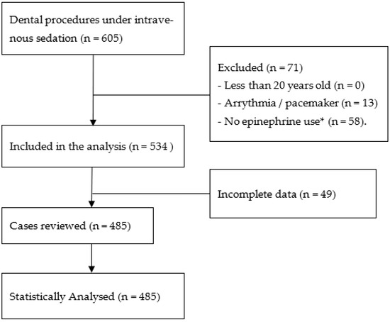 Flow chart of the case selection criteria. * Cases did not receive infiltration anesthesia and infiltration anesthesia without epinephrine.