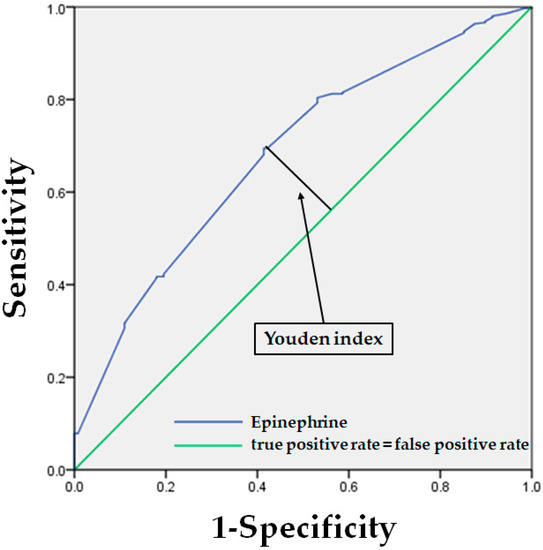 Receiver operating characteristic curves representing epinephrine cut-off value with Youden index.