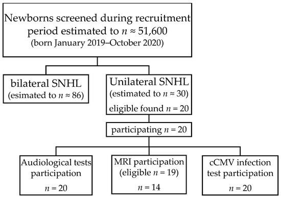 Estimated and included number of participants. Estimated numbers are based on previous universal neonatal hearing-screening results from Region Stockholm ([2], >30,000 screened, 98% coverage rate), and the documented number of newborns during 2019 and 2020 in Region Stockholm [46]. One subject was born with a heart anomaly, which is the reason for 19 subjects eligible for MRI. cCMV = congenital cytomegalovirus; MRI = magnetic resonance imaging; SNHL = sensorineural hearing loss.