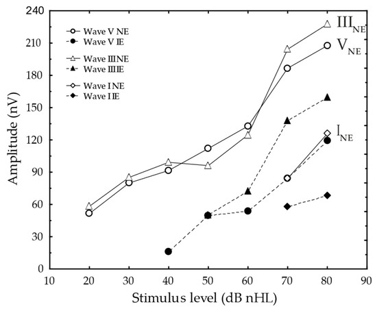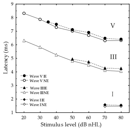 The ABR was recorded in 10 dB steps whenever possible, from 70 dB nHL down to the threshold or 20 dB nHL minimum. The 70 dB nHL level was chosen as the main supra-threshold level for analysis of the ABR I–V interval. If the ABR waves I and V could not be discerned at 70 dB nHL, the input level was increased in 10 dB steps up to a maximum of 80 dB nHL for the NE, and 90 dB nHL for the IE.