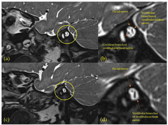 Typical MRI images of the inner auditory canal for subjects with cochlear nerve aplasia (oblique-sagittal view); (a,b) The normal-hearing ear (NE) of subject 11 (S11) showing a normal cochlear branch of the vestibucochlear nerve; (c,d) The impaired ear (IE) of S11 showing no visible cochlear nerve branch, indicating aplasia or severe hypoplasia.