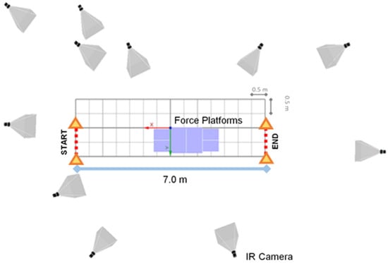 The gait analysis area was defined as a region of 7.0 m length and 1.0 m width, with the first pair of force platforms placed at its midpoint, and delimited by a pair of signaling cones, as depicted in Figure 1. This region coincided with the motion capture system calibrated volume.
