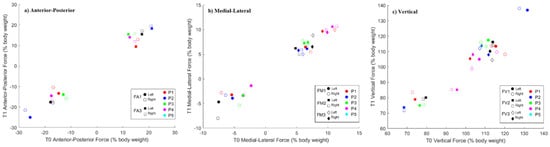 Scatterplot of the ground reaction force (% body weight) produced by each subject and limb at T1 in respect to T0 in the (a) anterior-posterior, (b) medial-lateral and (c) vertical directions, at the respective force characterizing events. FA1: maximum posterior loading force; FA3: maximum anterior thrusting force; FM1: first maximum lateral force; FM3: second maximum medial force; FV1: first maximum vertical loading force; FV2: dip trough force; FV3: second maximum vertical thrusting force.