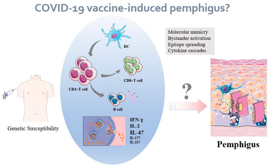 An unproven hypothesis: mechanisms of COVID-19 vaccine-induced pemphigus? It is hypothesized that vaccination against COVID-19 could trigger an immunological response in genetically predisposed individuals. The vaccine-related autoimmune responses may include molecular mimicry, bystander activation, and epitope spreading, etc. The similar components of human protein promote dendritic cell maturation and elicit robust T and B cell responses, thereby subsequently activating bystander autoreactive lymphocytes and episode spreading, along with large amounts of cytokines, concurrently contributing to the autoimmune inflammation in pemphigus patients.