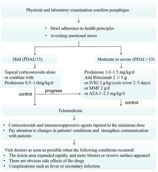 Dermatology is a visual specialty that is particularly suitable for telemedicine, which is conducted on a virtual platform to remotely deliver health information such as diagnoses or consultations and perform internet-based management as well as social care [71]. Given that social distancing is one of the most effective safeguards to limit the spread of the virus, it is recommended that mild or stable cases of pemphigus patients could adopt teledermatology for following-up so as to minimize patient referrals to healthcare centers [72]. Glucocorticoids and steroid-sparing immunosuppressants ought to be tapered to the minimum possible necessary dose. For mild pemphigus (PDAI ≤ 15), topical corticosteroids could be applied alone or combined with a systemic corticosteroid treatment at the dose of prednisone 0.5–1.0 mg/kg/day [8]. Specifically, 10 mg daily of prednisone-equivalent is the common permitted steroid dose within clinical studies [73], on account of ≥20 mg of prednisone being regarded as a usual cutoff threshold to present its immunosuppressive properties [14]. In the circumstances that patients are in a stable condition, the cessation of the immunosuppressants is not recommended, since interruption may mediate dysregulation of inflammatory cytokines, which may possibly exacerbate pemphigus activity, resulting in an increased risk of viral infection and mortality [74]. The disease inflammation control by means of immunosuppressants is likely to reduce aggressive organic responses to SARS-CoV-2. Hospitals should vigorously promote online medical care and provide drug mailing services for patients with stable conditions. Doctors must take advantage of the online platform to strengthen communication with patients, closely monitor the changes in patients’ conditions, and carefully adjust the treatment regimen [75].