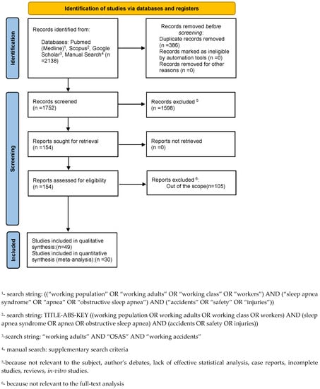 - Pubmed: ((“working population” OR “working adults” OR “working class” OR “workers”) AND (“sleep apnea syndrome” OR “apnea” OR “obstructive sleep apnea”) AND (“accidents” OR “safety” OR “injuries”)).