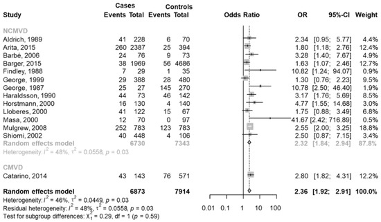 A subgroup meta-analysis was performed based on the types of drivers. Only one study [25] considered the CMVD drivers. In the group of NCMVD drivers [24,40,41,43,45,46,47,48,50,52,53,65,70], the pooled OR was equal to 2.32 (95% CI 1.84–2.34), a significant effect in line with the overall meta-analysis (Figure 2).