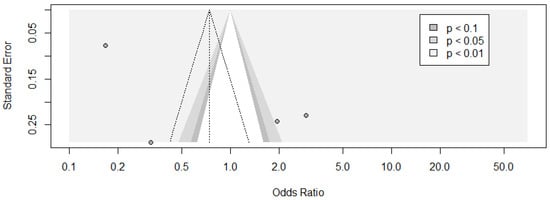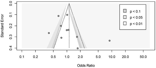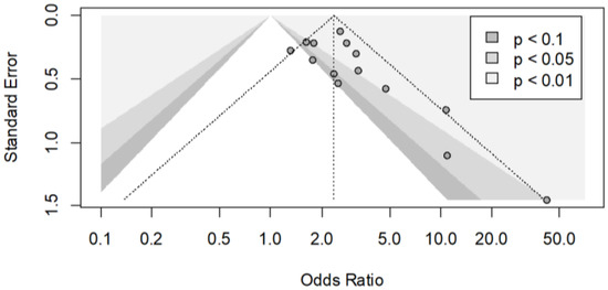 The funnel plot seemed to be asymmetrical, and this was confirmed by Begg’s test (p = 0.016) (Figure 3). The contour-enhanced funnel plot presents three shaded areas based on the significance levels (<0.01, <0.05, <0.1). The plot clearly indicates that there were three small studies with significant effects despite having a large standard error. There were no studies with a similar standard error that were not significant. Hypothetically, “imputing” the missing studies in the lower left corner of the plot would increase the symmetry, and consequently, these studies would lie in the non-significance region of the plot, or they would have a significant negative effect. In the upper side of the plot, there were large studies, some of which presented significant results of p < 0.05 or p < 0.10, and the distribution of effects is less asymmetrical. In conclusion, the inspection of the plot suggested that the asymmetry may be caused by publication bias.