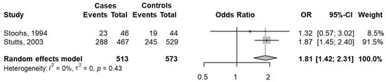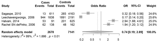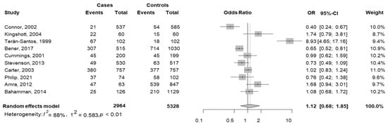 Considering the study design, 2 studies were cross-sectional [23,28] and 8 were case–control [42,49,51,54,55,59,60,61]. In each group, the pooled OR was not significant (cross-sectional pooled OR = 2.08, 95% CI 0.59–7.39; case–control pooled OR = 1.08, 95% CI 0.57–2.04). No difference between the two groups was observed (p = 0.363); within each subgroup, the variability was high and significant (p < 0.001).
