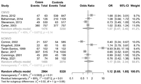 Based on the types of drivers we performed a subgroup meta-analysis. Four studies [23,28,59,60] considered CMVD drivers, and the remaining six [42,49,51,54,55,61] NCMVD drivers. In the first group, the result was not significant; the pooled OR was equal to 1.07 (95% CI 0.47–2.46), and the heterogeneity between studies in this group was not significant (I2 = 45%; p = 0.14). In the second group, the result was also not significant; the pooled OR was equal to 1.17 (95% CI 0.58–2.34), and the heterogeneity between studies in this group was high and significant (I2 = 93%; p < 0.001). Between the two groups, there was not a significant difference (p = 0.88) (Figure 6).