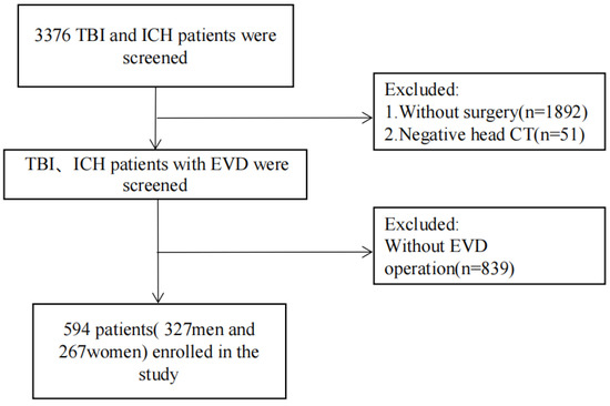 | Variables | With EVD-Associated Intracranial Infections (n = 143) | Without EVD-Associated Intracranial Infections (n = 451) | p |