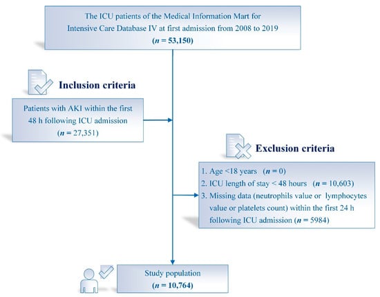 A total of 53,150 ICU patients at first admission were recorded in the MIMIC-IV. The flowchart of this study and the number of patients is presented in Figure 1. Only patients diagnosed with AKI were included. The exclusion criteria were as follows: (1) age <18 years; (2) length of stay in ICU < 48 h; (3) missing platelets count or neutrophils or lymphocytes values at ICU admission.