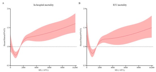 Relationship between the SII and the risk of all-cause mortality. (A) Relationship between the SII and in-hospital mortality. (B) Relationship between the SII and the ICU mortality. Shaded areas around the curves depict 95% confidence interval. SII, Systemic-immune inflammation index; ICU, Intensive care unit.