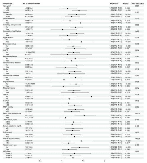 In our exploratory analysis of subgroups, no significant interactions were observed for gender, CAD, CHF, diabetes mellitus, COPD, respiratory failure, stroke, malignant tumor, SAPSII, MBP, WBC count, SCr, BUN, AKI stage or vasopressors use when patients were stratified according to potential confounders. However, SII had an interaction with age, atrial fibrillation, hypertension, CKD, chronic liver disease, hepatic failure, SOFA, heart rate and lactate. SII may be valuable for the prognosis evaluation of AKI patients with atrial fibrillation or hypertension, but seemed to be of weak prognostic value for AKI patients with CKD, chronic liver disease and hepatic failure. Similarly, the previous study also showed that raised SII was associated with an increased risk of the postoperative recurrence of atrial fibrillation and independently predicted the recurrence of atrial fibrillation after cryoablation concomitant with mitral valve surgery (OR, 3.719; 95% CI, 1.417–9.760) []. Although there was no research on the correlation between SII and hypertension, the interconnection of inflammation and the pathogenesis of hypertension has been recognized [,]. In addition, patients with SOFA score ≤ 6, heart rate ≤ 85 beats/minute and lactate ≤ 1.8 mmol/L had a higher risk of all-cause mortality for higher SII. Although possible interactions between these clinical factors and SII have been observed, little is known about the mechanisms and further studies are needed to confirm their relationship.