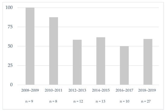 Evolution of the percentage of sickle cell patients who received pre-cholecystectomy prophylactic transfusion in our center.
