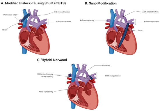 The surgical procedure (Figure 2) selected to repair single ventricle defects in infants with HLHS is critical in that these infants comprise 67% of all cardiac NEC cases [10,24]. Infants with DD systemic circulation typically undergo Stage I Norwood palliation via reconstruction of the aortic arch, combined with either a subclavian or innominate artery to pulmonary artery shunt (modified Blalock–Taussig shunt (mBTS)) or a right ventricular to pulmonary artery shunt (Sano modification) [69]. The use of mBTS has been associated with decreased systemic perfusion due to retrograde diastolic flow through the SMA and aorta, similar to what is observed in premature infants with a hemodynamically significant PDA [15]. A high incidence of NEC following Stage I Norwood palliation with mBTS, potentially influenced by the shunt size-to-body weight ratio [70], has resulted in a surgical preference toward the Sano modification. The Sano modification is thought to reduce NEC risk via a reduction in retrograde diastolic flow [32,71,72,73], as well as potentially reduce the time to enteral feeds [71]. However, SMA perfusion following either Stage I method has been demonstrated to be impaired, compromising blood flow to the gut and escalating the risk of NEC development [74,75]. A third palliative approach is now available, utilizing bilateral banding of the pulmonary arteries and arterial duct stenting [76]. This less invasive ‘hybrid’ approach offers benefits in that CPB and hypothermic circulatory arrest are not required, reducing the risk of mesenteric ischemia, postoperative low cardiac output, and CPB-associated neurodevelopmental delays. Despite these advantages, the ‘hybrid’ approach does not appear to decrease the time to enteral feeding, carries a high rate of abdominal complications [77], does not improve postoperative hemodynamic stability or oxygen transport compared with traditional Norwood Stage I palliation [78], and thus far, does not appear to reduce risk of NEC [79]. However, an interventional transcatheter technique for bilateral pulmonary artery banding without the requirement for surgery has been recently described [80], providing a promising outlook.