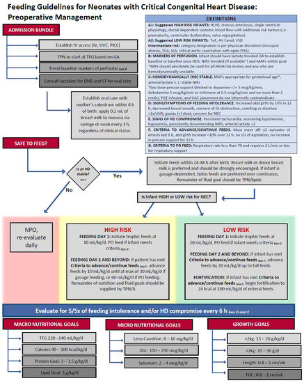 In the United States and Europe, pre- and postoperative feeding practices for infants at risk of cardiac NEC have varied widely [92]. Most feeding practices in this population are extrapolated from clinical guidelines intended for critically ill neonates or those at risk of developing NEC, such as The American Society for Parenteral and Enteral Nutrition (ASPEN) guidelines [93]. In the CHD infant, cardiac diagnosis, PGE use and dose, utilization of umbilical venous or arterial catheters, and vasoactive drug administration are factors generally considered before feeds are initiated, while serum lactate levels, gastric residual volumes, and arterial blood gas oxygenation levels are commonly used benchmarks to assess readiness for feeds [94]. A 2017 survey conducted by The European Society of Pediatric and Neonatal Intensive Care indicated that only a third of pediatric intensive care units (PICUs) utilize preoperative or postoperative nutritional guidelines [94]. However, the use of standardized feeding protocols, rather than individual provider discretion, has been effective in improving patient outcomes [95,96,97,98]. In infants following HLHS Stage I palliation, del Castillo et al. found a significant decrease in NEC development when standardized protocols advancing HM or hydrolyzed formula feeds slowly over a 7 d period were followed, rather than individual provider discretion [75]. While those infants on standardized protocols required a longer period before full feeds, clear guidance on interruptions for feeding intolerance resulted in reduced hospital LOS. Furlong–Dillard et al. implemented a standardized feeding protocol in infants with complex CHD. When compared with previous variable practitioner preferences, the standardized protocol increased rates of preoperative feeding and reduced postoperative total parenteral nutrition (TPN), without increasing complications [97]. Based on available studies, our institution has developed standardized preoperative feeding protocols for neonates with critical CHD (Figure 3), focused largely on hemodynamic stability and the perceived risk of NEC development [97,99,100,101,102,103,104]. Globally, however, extreme variability in enteral feeding guidelines puts CHD neonates at risk of malnutrition, growth failure, and poor postoperative outcomes [105,106].