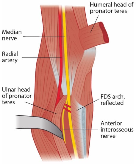 - Fuss, F.K.; Wurzl, G.H. Median Nerve Entrapment. Pronator Teres Syndrome. Surgical Anatomy and Correlation with Symptom Patterns. Surg. Radiol. Anat. 1990, 12, 267–271. [Google Scholar] [CrossRef] [PubMed]