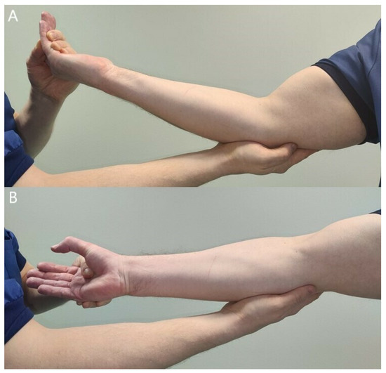 Resisted elbow flexion tightens the lacertus fibrosus and compresses the median nerve, causing local pain and sometimes distal paresthesia (A). Resisted forearm pronation in full supination tightens the pronator teres and compresses the median nerve (B). Local pain and a loss of pronation power can be observed compared with the unaffected side.