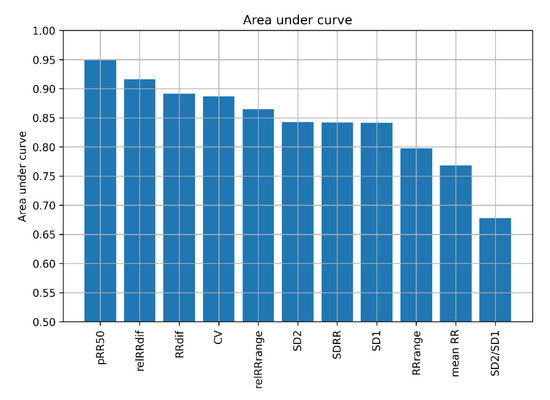 Area under receiver operating characteristic curve (AUC) of heart rate variability features. pRR50—percentage of successive differences between RR intervals greater or equal to 50 ms; SD1 and SD2—standard deviation of points in the Poincare plot across and along the identity line, respectively; SDRR—standard deviation of RR intervals; RRdif—mean of absolute differences between successive RR; CV—coefficient of variance; relRRdif = RRdif/(mean RR); mean RR—mean of RR intervals; RRrange = max(RR) − min(RR); relRRrange = RRrange/(mean RR) (relative RRrange).