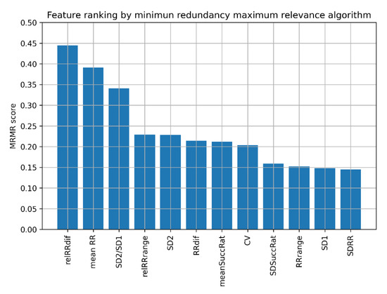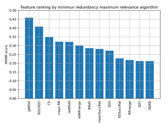 For this reason, we decided to use the MRMR algorithm to select the best feature sets for AF detection for ML algorithms. It is a filter-based feature selection algorithm [60], which orders the most relevant features providing minimal redundancy between subsequent features simultaneously. MRMR scores obtained for 60 s ECG recordings are presented in Figure 2.