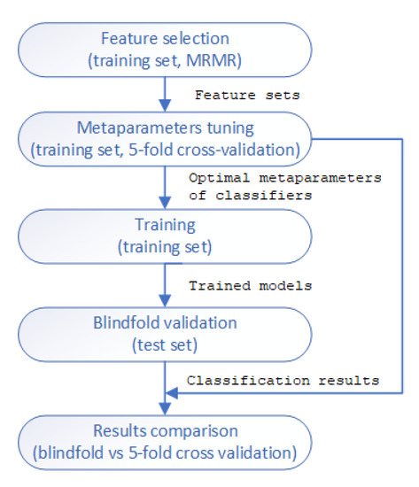 The methodology of classifier training in the study is presented in Figure 4. First, MRMR was used for feature selection (on the training set).