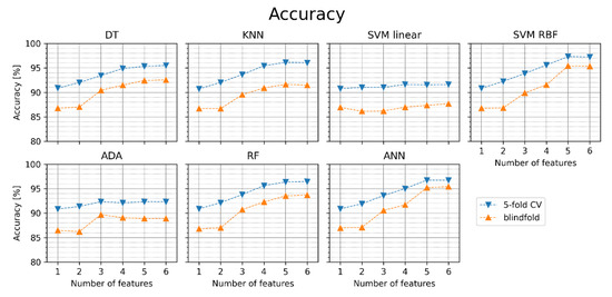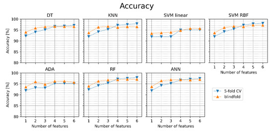 Figure 5 presents the accuracy obtained in our experiments. The orange points in the figure relate to the blindfold validation on the test set and the blue points to the 5-fold cross-validation. The same convention of presenting the results has been applied to other classification metrics in Figure 6, Figure 7, Figure 8 and Figure 9. Average values and standard deviations of accuracy are shown in Table 4. Standard deviations are small (below 0.5 pp), which is why similar tables are not included further in this paper for other classification metrics. Figure 4 indicates that for most ML classifiers, the increase in the number of features improves the accuracy of AF detection in both cases: for the cross-validation and the blindfold validation. In all classifiers, except for SVM linear and ADA, accuracy in blindfold validation drops below the 5-fold CV level for four-six features. The obtained results are better for DT, KNN, RF, SVM RBF, and ANN than for SVM linear and ADA. SVM RBF with five features achieved the highest accuracy in the blindfold validation (97.2%). The results suggest that using the simpler classification algorithms as DT and KNN can provide comparable or slightly worse accuracy and other performance metrics (see Figure 6, Figure 7, Figure 8 and Figure 9) than the relatively more complex algorithms such as SVM RBF, RF, or ANN.