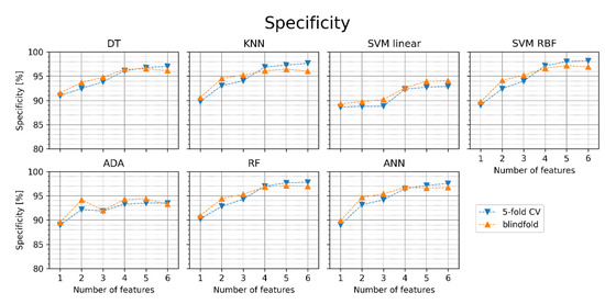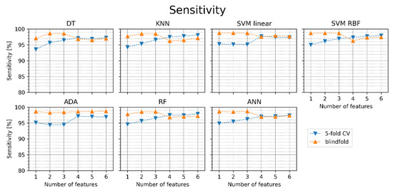 Figure 6 shows the sensitivity for the particular classifiers obtained in the same experiments as the accuracy in Figure 5. The achieved sensitivity values are similar for all classifiers. In the 5-fold cross-validation, the increase in the number of features improves sensitivity, but most classifiers reach the maximum for three features in the blindfold validation. Similarly, as in the case of accuracy, the obtained sensitivities are often greater for the blindfold validation than for cross-validation. SVM linear with one feature achieved the highest sensitivity in the blindfold validation (98.8%).