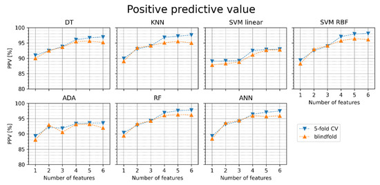Then, sets of one to six features with the highest MRMR scores were used for the metaparameter tuning of the classifiers (in case of DT—the maximum depth of the tree, in KNN—the number of neighbors K, in SVM with linear kernel—the soft margin C, in SVM with RBF kernel—both the soft margin C and inverse of kernel’s width gamma, in RF—the maximum depth and number of classifiers, in ADA—the number of classifiers, in ANN—the number of hidden neurons). The 5-fold cross-validation on the training set was used to find the best metaparameters of the classifiers. The metaparameters for which the highest average accuracy in the 5-fold cross-validation was achieved were chosen as the best for each feature set. Then, the classifiers with optimal metaparameters were trained on the training set, and their performance was validated on the test set. The results were then compared with the results obtained for the 5-fold cross-validation. We calculated the accuracy, sensitivity, specificity, positive predictive value (PPV), and diagnostic odds ratio (DOR) [66] of the classification. We decided to include DOR as a useful single metric in diagnostic testing. DOR is rarely reported in the literature on AF detection, with exceptions like [40].