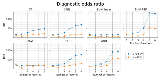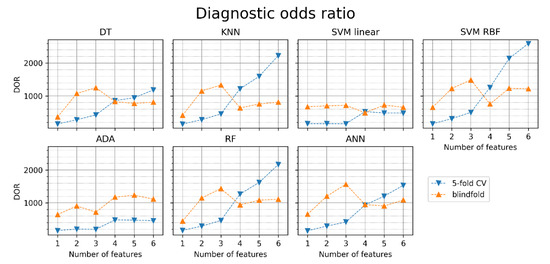 The classification metrics (accuracy, sensitivity, specificity, positive predictive value, and diagnostic odds ratio—DOR [66]) obtained by the ML classifiers in the 5-fold cross-validation and blindfold validation are presented in Figure 4, Figure 5, Figure 6, Figure 7 and Figure 8. For each classifier, one to six features with the highest MRMR scores were used for training, as summarized in Table 3.