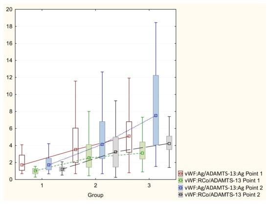 | vWF:RCo/ADAMTS-13:activity Point 2 | 1.5 ± 1.7 p = 0.0298 ^ | 3.5 ± 2.2 p = 0.0281 ^ | 4.5 ± 2.0 p = 0.0285 ^ | <0.0001 0.0065 *; 0.0019 **; 0.0498 *** |