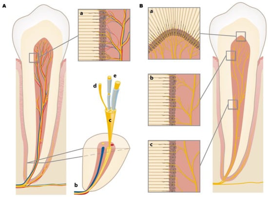 (A) Pulp-dentinal complex vascularization and innervation. (a) blood vessels (red and blue) and sensory nerves (yellow) from pulp chamber to dentinal tubules forming the plexus of Raschkow; (b) neurovascular bundle at tooth apex; (c) nerve bundle; (d) unmyelinated nerve fiber; (e) myelinated nerve fibers; (B) tooth innervation; (a) the coronal aspect of the pulp chamber presents highly packed nerve terminals that progressively decrease in cervical (b) and apical direction (c) nerve terminals both end in the odontoblastic layer and within the dentinal tubules.