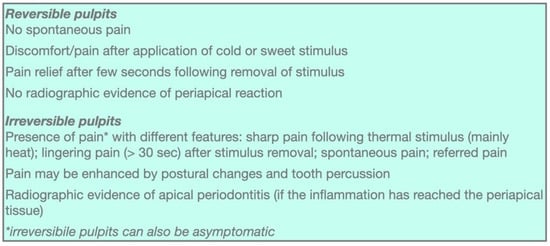 At present, the severity of pulp inflammation can be clinically assessed only by soft and hard tissue examination, with subjective interindividual patient’s pulp sensitivity test responses and radiological examination (Figure 2). The pulpal inflammation degree is often determined after applying a cold stimulus that can induce an exaggerated and “lingering” response due to C-fiber sensitization and inflammation-induced hypersensitivity []. However, when considering these diagnostic criteria, a quantitative pain evaluation to be able to reliably differentiate between pain induced by reversible or irreversible pulp inflammation is not possible []. From a biological point of view, the difference between reversible and irreversible pulpitis is related to specific in situ inflammatory mediator expression levels []. Even though pain is one of the main symptoms of infection/inflammation, its presence or intensity does not precisely correlate with the pulp tissue involvement extent and histopathological status severity []. Indeed, it should be stressed that a pulpitis may often be asymptomatic [] (Figure 3).