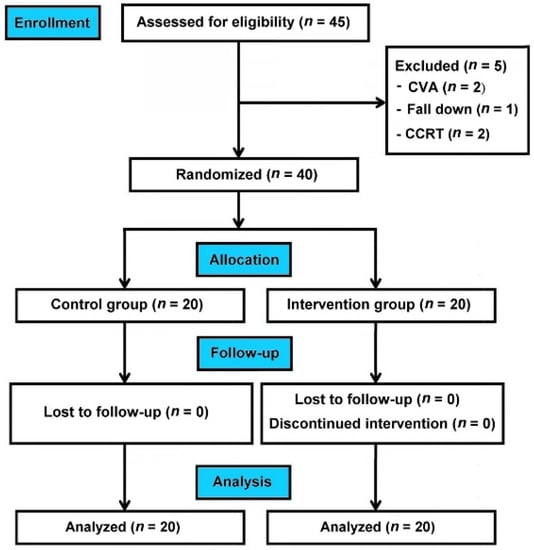 This randomized controlled trial enrolled 40 patients with HNC who were equally divided into the control and intervention groups. Figure 1 shows the flowchart of patient deposition. All the enrolled patients completed the experimental protocol during the 12-week study period. No adverse events were reported, and all the participants provided complete data. Table 1 shows the comparisons of baseline demographic data between these two study groups. No significant differences in all measured parameters were found between these two study groups.