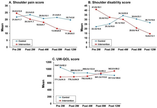Figure 2. Changes in mean scores for shoulder pain (A), shoulder disability (B), and UW-QOL (C) over time during the study period. Mean scores were expressed as absolute values. UW-QOL, University of Washington Quality of Life Questionnaire. Post 2W, 4W, 8W, and 12W represent assessments at 2, 4, 8, and 12 weeks after surgery, respectively.