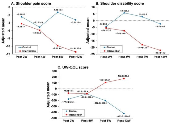 Figure 3. Changes in adjusted mean scores for shoulder pain (A), shoulder disability index (B), and UW-QOL (C) over time during the study period. Adjusted mean scores were estimated using the analysis of covariance (ANCOVA) model in Table 3 and were expressed as absolute values. UW-QOL, University of Washington Quality of Life Questionnaire. Post 2W, 4W, 8W, and 12W represent assessments at 2, 4, 8, and 12 weeks after surgery, respectively.