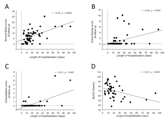 GG at CTH correlated inversely with total lung capacity, residual volume and DLCO at follow-up (r = −0.45; p = 0.003 for TLC; r = −0.42; p = 0.01 for RV; r = −0.48; p = 0.02 for DLCO). The length of hospitalization also correlated inversely with DLCO at follow-up (r = −0.43; p = 0.0005, Figure 2D).