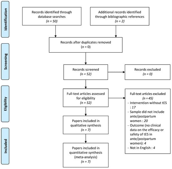 The initial search on PubMed and ScienceDirect was conducted until 31 December 2021 and provided 52 potentially eligible studies. No duplicates were found, and no article was excluded after assessing its title and abstract. After a full-text review of the 52 remaining reports, 45 were excluded: 20 studies had a different population, 17 reports did not assess tES, 4 studies were not written in English, and 4 did not present outcomes (clinical data on the efficacy or safety of tES in ante/postpartum women). As a result of the selection criteria, seven papers were selected (see Figure 1). In addition, three local case reports (described below) were added. Finally, seven papers were selected for the systematic review.