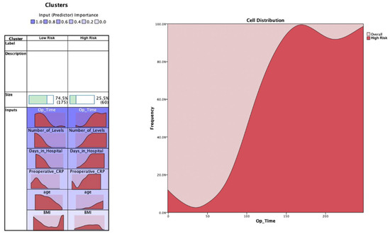 K-means cluster analysis for the raw hospital length of stay target variable (continuous scale). The most important feature to classify the data was the operation time, followed by the number of levels, LOS, preoperative CRP, age, and BMI. The distribution charts show the distribution of the features for both clusters. An example feature (operation time) is shown to help interpretation. The selected feature shows that the distribution of operation time is right-shifted for the high risk cluster, whereas it is left-shifted for the low risk cluster.