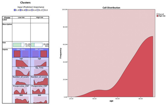 K-means cluster analysis for the binary hospital length of stay class (normal versus prolonged). The most important feature to classify the data was the hospital length of stay class (DIH_class), followed by age, operation time, number of levels, preoperative CRP, and BMI. The distribution charts show the distribution of the features for both clusters. An example feature (age) is shown to help interpretation. The selected feature shows that age distribution is right-shifted for the high risk cluster (including the prolonged hospital stay class), whereas it is left-shifted for the low risk cluster.
