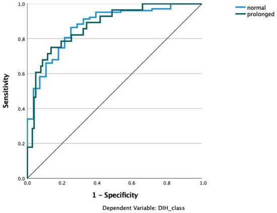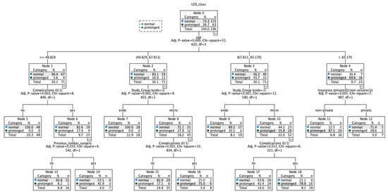 Finally, we developed a decision tree utilizing the CHAID growing method for simple interpretation in clinics (Figure 7). The algorithm could detect 84.7% of the cases correctly. How to read the CHAID decision tree: for example, an age ≤ 49.829 resulted in 94.4% of normal and only 5.6% of prolonged LOS cases. An absence of complication after this node further results in all cases having normal LOS. In addition, an age between 49.829–67.811 results in 83.1% of cases having normal LOS. Of these cases who underwent endoscopic decompression, all patients had normal LOS. In contrast, an age of >83.170 results in most cases having prolonged LOS (69.6%). Most of these cases had prolonged LOS with a non-private insurance type.