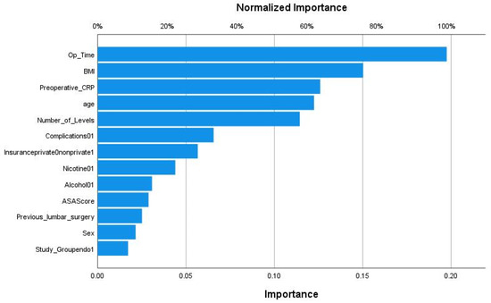 We applied various machine learning and deep learning algorithms to predict the LOS classes in the next step. The AUC for the multilayer perceptron model reached the highest AUC with 0.873 (Figure 3). The feature importance analysis revealed that operation time was the most important feature for the classification task, followed by BMI, preoperative CRP, and age (Figure 4). 0: normal LOS; 1: prolonged LOS.