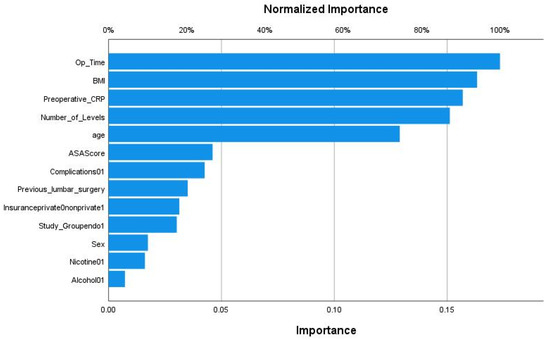 The AUC for the radial basis function neural network model (RBNN) reached an AUC of 0.847 (Figure 5). The MLP model’s feature importance analysis revealed that operation time was the most important feature for the classification task, followed by BMI and preoperative CRP. However, the number of levels reached higher importance than age with this model age (Figure 6).