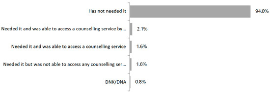 A total of 94% of the women had no need to resort to counselling or consultations about contraceptive methods during the confinement period, whereas 5% of the interviewees stated that they needed to access contraceptive counselling, as can be seen in Figure 1; of these, 30% failed to receive it, 39% were not able to access the service via telephone calls, and 30.7% did so in-person.
